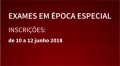 Nos termos do RAUÉ e do Calendário de Procedimentos Académicos, a inscrição para a realização de exames em Época Especial de 2017/18 decorre de 10 a 12 de junho, sendo que a época de exames decorre de 14 a 27 de julho.